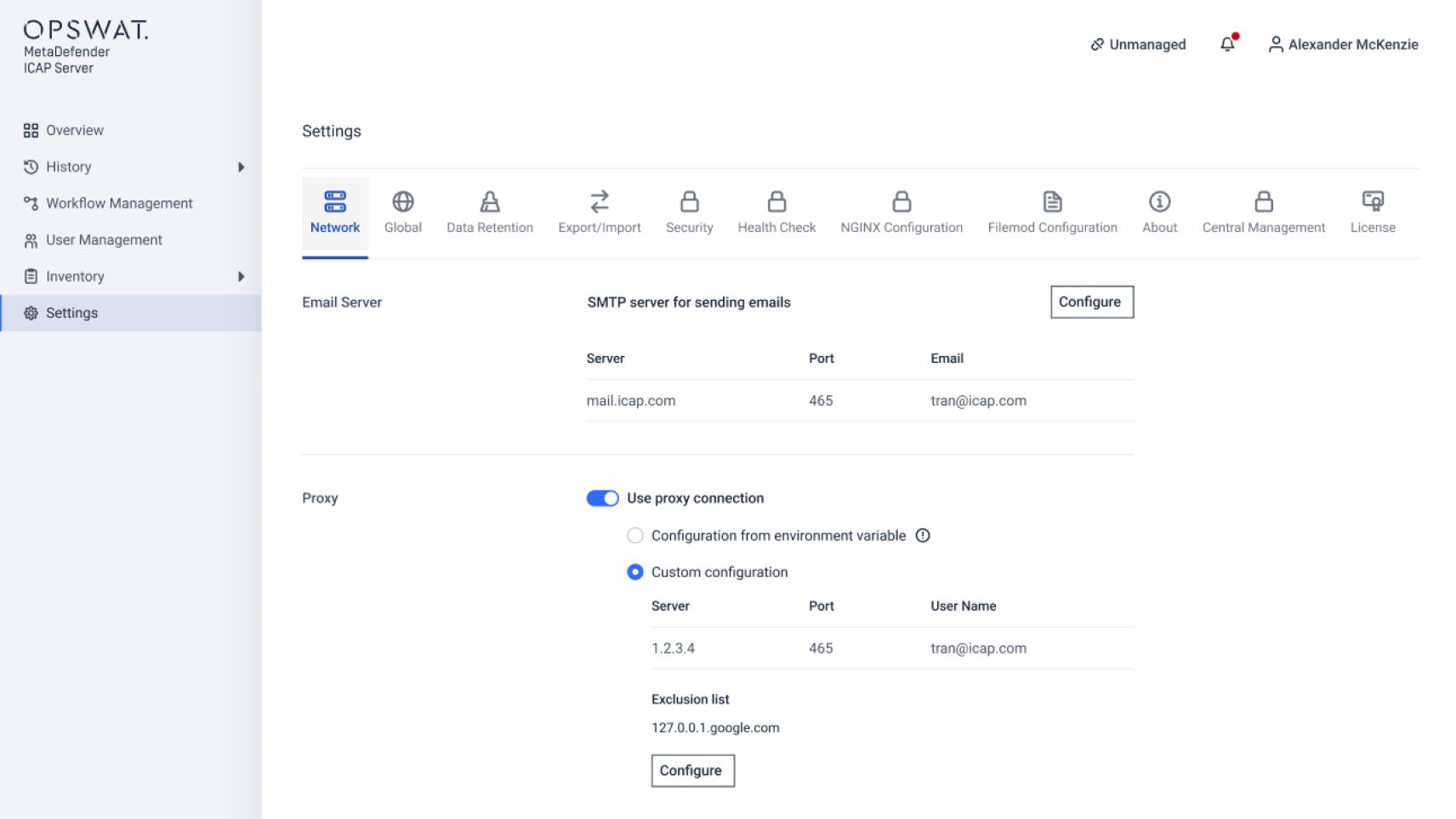 Gli amministratori IT possono ora definire impostazioni proxy separate per le diverse funzionalità che richiedono connessioni in entrata e in uscita. Questa funzione garantisce l'ottimizzazione della connessione e dell'efficienza quando si integra MetaDefender ICAP Server con un dispositivo di sicurezza di rete.