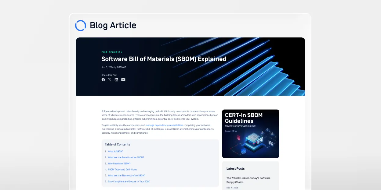 Non sorprende che i governi e l'industria ora richiedano gli SBOM per garantire una catena di fornitura del software sicura. OPSWAT La SBOM migliora la sicurezza della catena di fornitura del software, consentendo ai team di proteggere le loro applicazioni e di rimanere conformi.